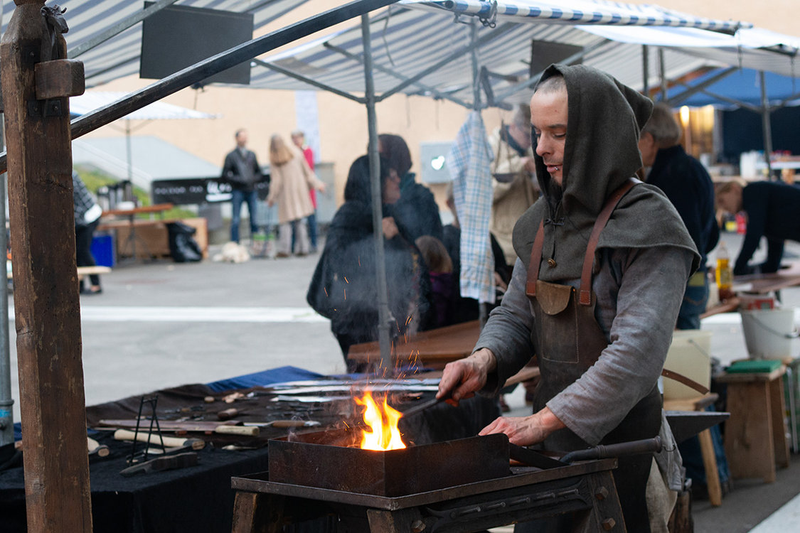 Im Museumsgarten demonstriert Schmied Reto Zürcher von der Waffenschmiede Huttwil sein Handwerk. Er hat sich auf Nachbildungen historischer Waffen und Werkzeuge aus Eisen spezialisiert. Wer mag, kann unter seiner Anleitung selbst einen Nagel schmieden.
