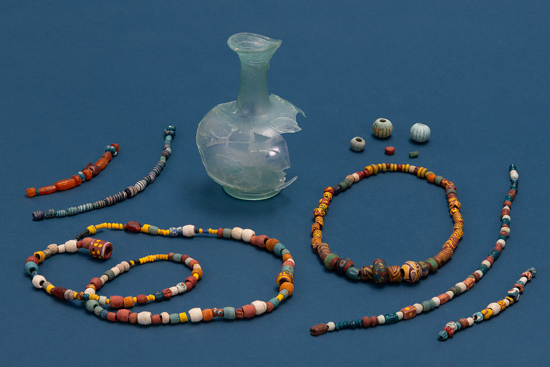 Die Glasgeschichte beginnt im Vorderen Orient. Wohl zufällig entdecken Menschen bei der Metallverarbeitung den glänzenden Werkstoff. Ägyptische Handwerker entwickeln eine glasartige Masse, die sie zu Figuren und Fläschchen formen. Auch die ersten Zuger Glasperlen aus einem Pfahlbaudorf in Cham bestehen aus dieser türkisfarbenen Masse. In der späten Bronzezeit kommen blau-weisse Glasperlen aus Norditalien in Mode. Zusammen mit Bernstein von der Ostsee werden sie zu dekorativen Ketten aufgefädelt.