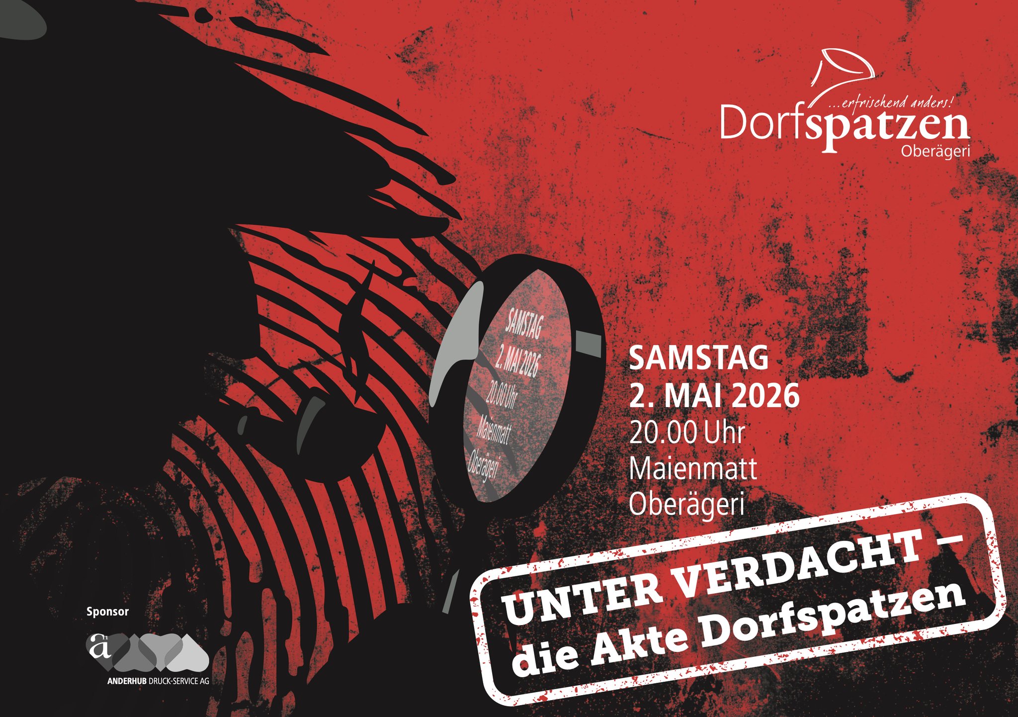 Zu unserem Jahreskonzert laden wir Sie herzlich in die Maienmatt in Oberägeri ein. Markus Steimen und seine Dorfspatzen präsentieren Ihnen mit dem Motto «Unter Verdacht - die Akte Dorfspatzen» ein spannendes und abwechslungsreiches Programm. Geniessen Sie einen Abend mit feinster Blasmusik. Wir empfehlen Ihnen, am Konzertabend Ihre eigenen Ermittlungen aufzunehmen, bevor Sie allenfalls selbst unter Verdacht geraten.