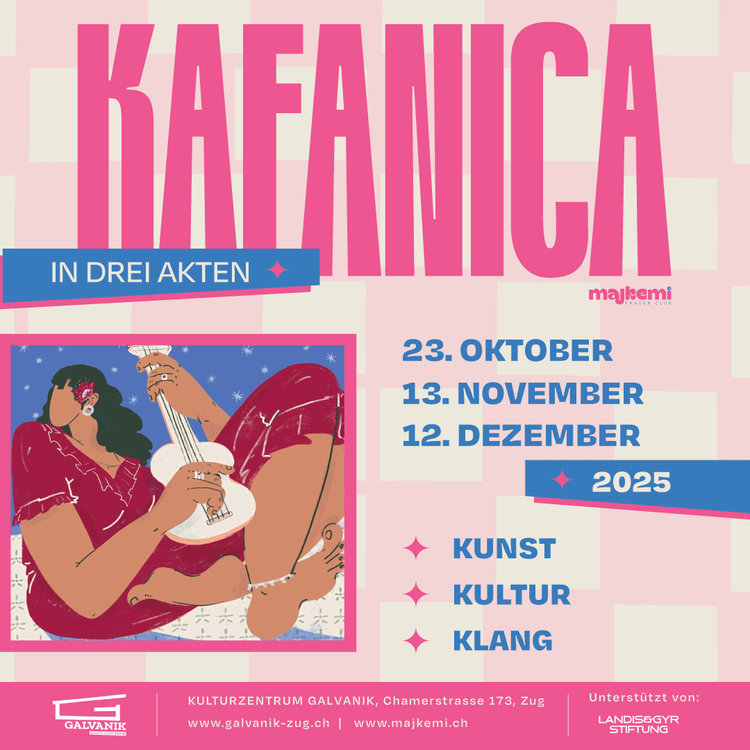 Im Herbst/Winter 2025 lädt der Verein Majke Mi FC zu einer besonderen Veranstaltungsreihe in die Galvanik Zug: Mit Kafanica in 3 Akten entsteht ein neuer Ort für Austausch, Kunst und kollektives Erinnern. Inspiriert von den Kafanas im ehemaligen Jugoslawien verwandelt sich die Galvanik an drei Abenden in einen offenen, lebendigen Raum zwischen Bühne, Wohnzimmer und Diskursforum.