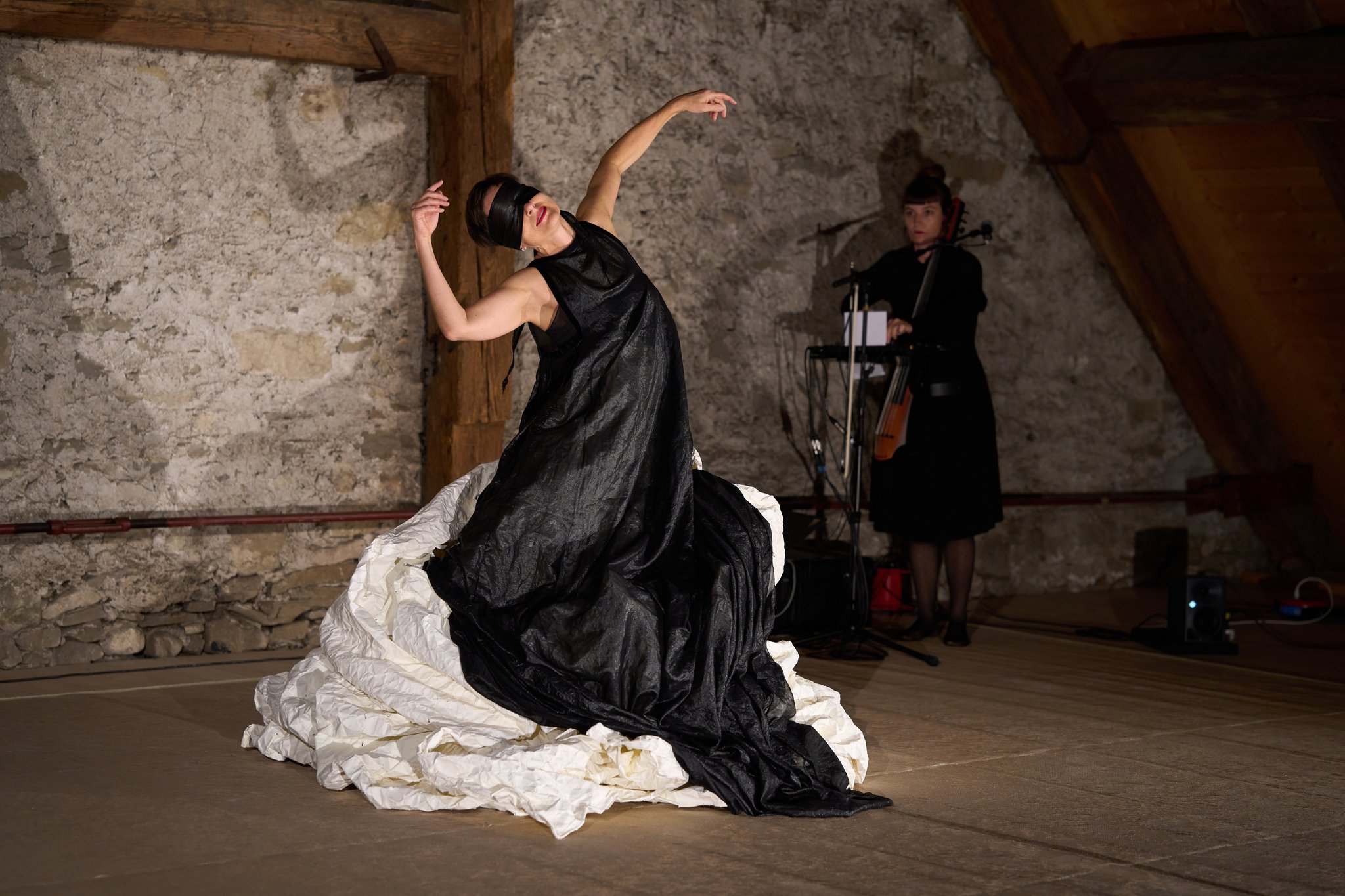 Zuschauende erleben eine vielschichtige Bildsprache, in der Körper, Geste und Objekte miteinander verschmelzen – eine visuelle Erfahrung, die sich im Moment entfaltet und nachwirkt. Papier spielt eine zentrale Rolle in Im Oberstegs Choreografien: Es trägt Spuren, reagiert auf Bewegung und vereint textile wie auch fragile Qualitäten. Als Metapher für Haut unterstreicht es die körperliche Präsenz und erzeugt eine besondere emotionale Tiefe – charakteristisch für ihre Arbeiten.