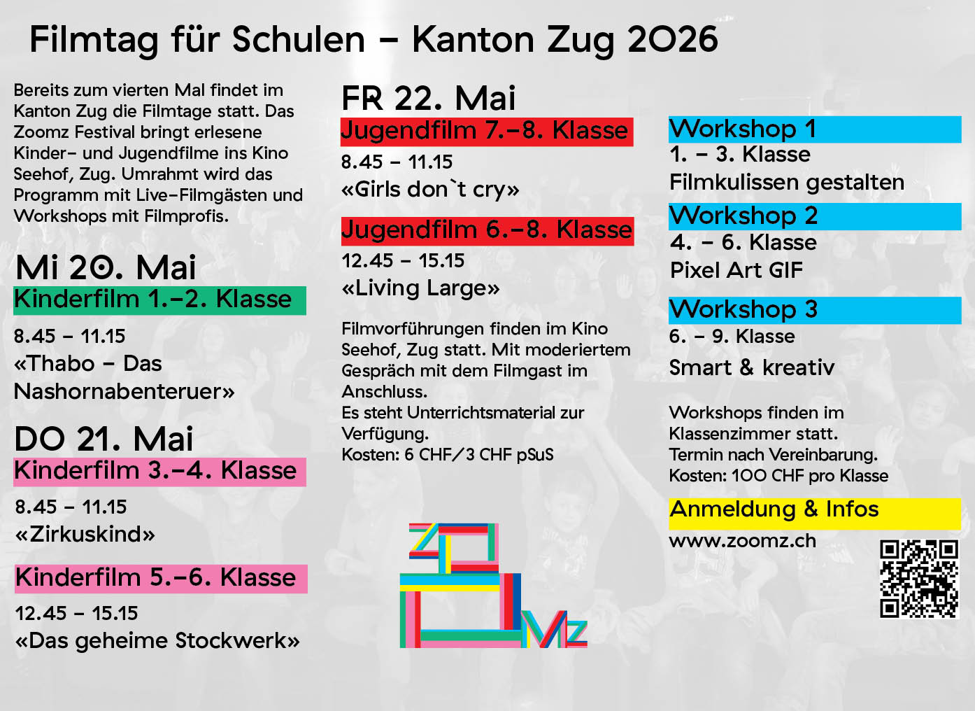 Das Zoomz Festival bietet Schulen eine einzigartige Plattform für Film- und Medienbildung. Beim Filmtag Zug präsentiert Zoomz eine hochkarätige Auswahl aktueller Kinder- und Jugendfilme und stellt didaktisches Begleitmaterial zur Unterrichtseinbettung bereit. Im Anschluss an die moderierten Vorführungen gibt es spannende Gespräche mit Filmschaffenden und jungen Darsteller:innen. Ergänzend vertiefen praxisnahe Workshops das Kinoerlebnis und laden die Schülerinnen und Schüler dazu ein, selbst kreativ zu werden.